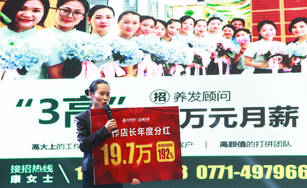 現(xiàn)場,和桂集團總裁黃偉文先生、源生堂執(zhí)行總經(jīng)理舒志華女士,為源生堂幾十位優(yōu)秀合作店長代表,進行2017年度百萬分紅頒獎。幾十位優(yōu)秀合作店長上臺領(lǐng)取個人年度分紅,除去工資后,最高個人年度分紅可達19萬元,引發(fā)全場尖叫與歡呼!舒總分享了《2018源生堂三大招》,現(xiàn)場招募養(yǎng)發(fā)顧問、合作店長、加盟老板,現(xiàn)場嘉賓及家人紛紛轉(zhuǎn)發(fā)分享。最后,黃總表示,2018年用分享成就未來,讓更多人實現(xiàn)老板夢。